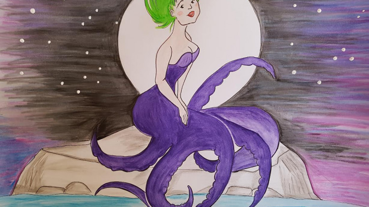 Als der Vollmond über dem Meer leuchtete, war der Mantel fertig. Die Meerfrau saß auf dem Stein, hielt ihn gegen das Mondlicht, lächelte und sagte: „Er ist lang, er ist schön. Du sollst dein Kind nun wiedersehn.“